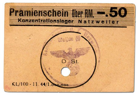 The most rare scrip of the exhibit is a single piece from Natzweiler. Rediscovered in an old collection in 1993, it is the only known scrip from this camp existing today. It has the Waffen SS validation stamp and is thought to be a sample reserved for the camp records due to a punched hole in the note. The scrip from the Sokolka Ghetto, with the unusual denomination of 0.91 marks, is also extremely rare. Few Jewish survivors have any recollection of the existence of scrip in the concentration camps and ghettoes where they were imprisoned. Jewish prisoners were generally not allowed the privileges afforded other prisoners, including receiving scrip.